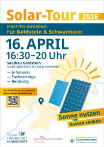 Die Infobörsen bringen das Thema Photovoltaik direkt vor Ihre Haustür. In verschiedenen Vorträgen erfahren Sie das Wichtigste zur Planung, Finanzierung und Umsetzung einer PV-Anlage. Das städtische Beratungsteam des Klimareferats und des Energiepunkts, regionale Solar-Fachbetriebe sowie weitere Initiativen wie Main Solar Balkon und der Verbraucherzentrale stehen Ihnen an Infoständen für individuelle Fragen zur Verfügung. So erhalten Sie ein optimales Beratungsangebot zu Dach- und Balkonanlangen.